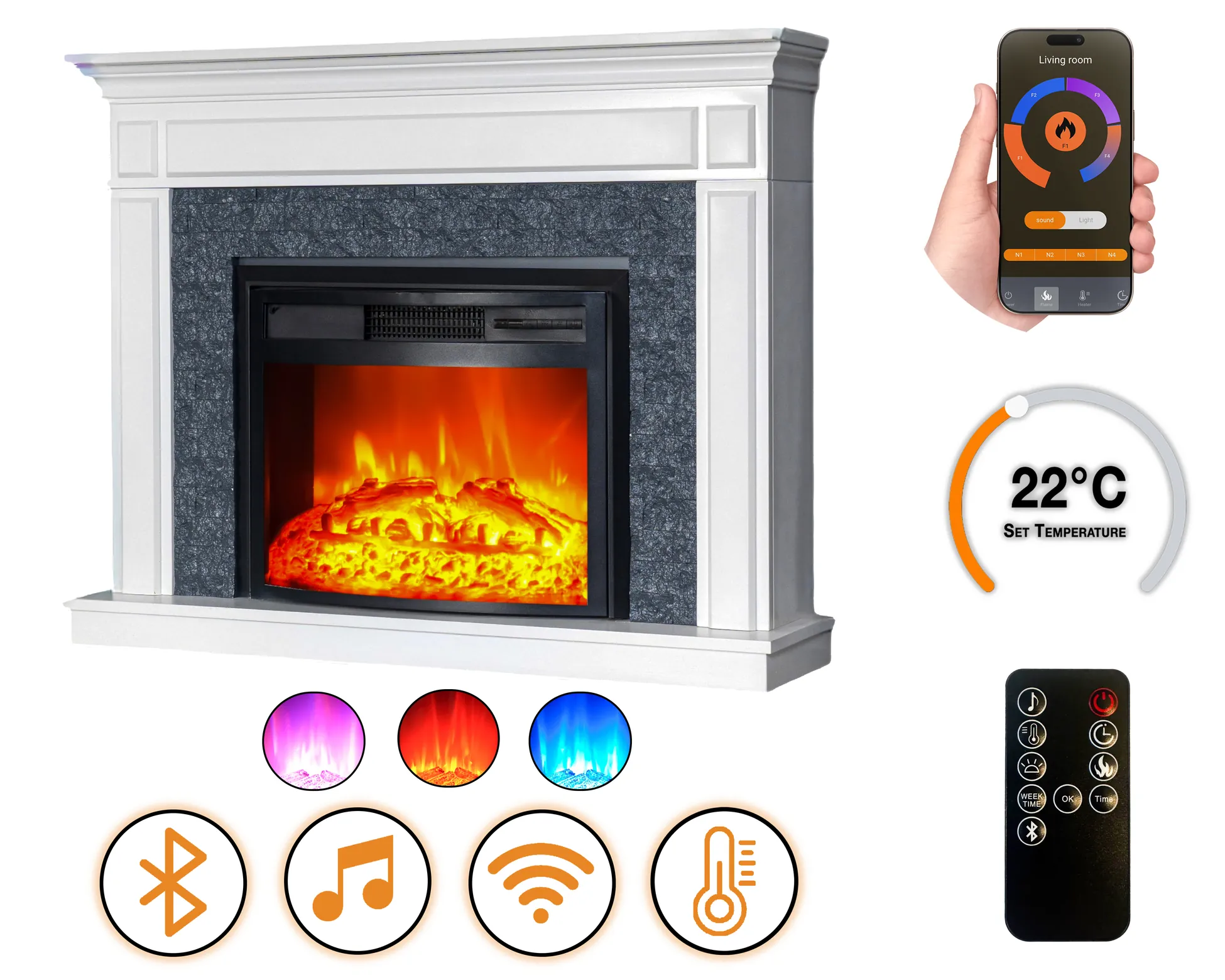 A beépített Bluetooth hangszóróval rendelkező Morella EF 4 zökkenőmentes hangintegrációt biztosít, így a kandallóélmény még teljesebb. A lángok függetlenül működtethetők a fűtéstől, négyféle színben állíthatók, és a ropogó tűz hanghatás valósághű, hagyományos kandallóhangulatot teremt.