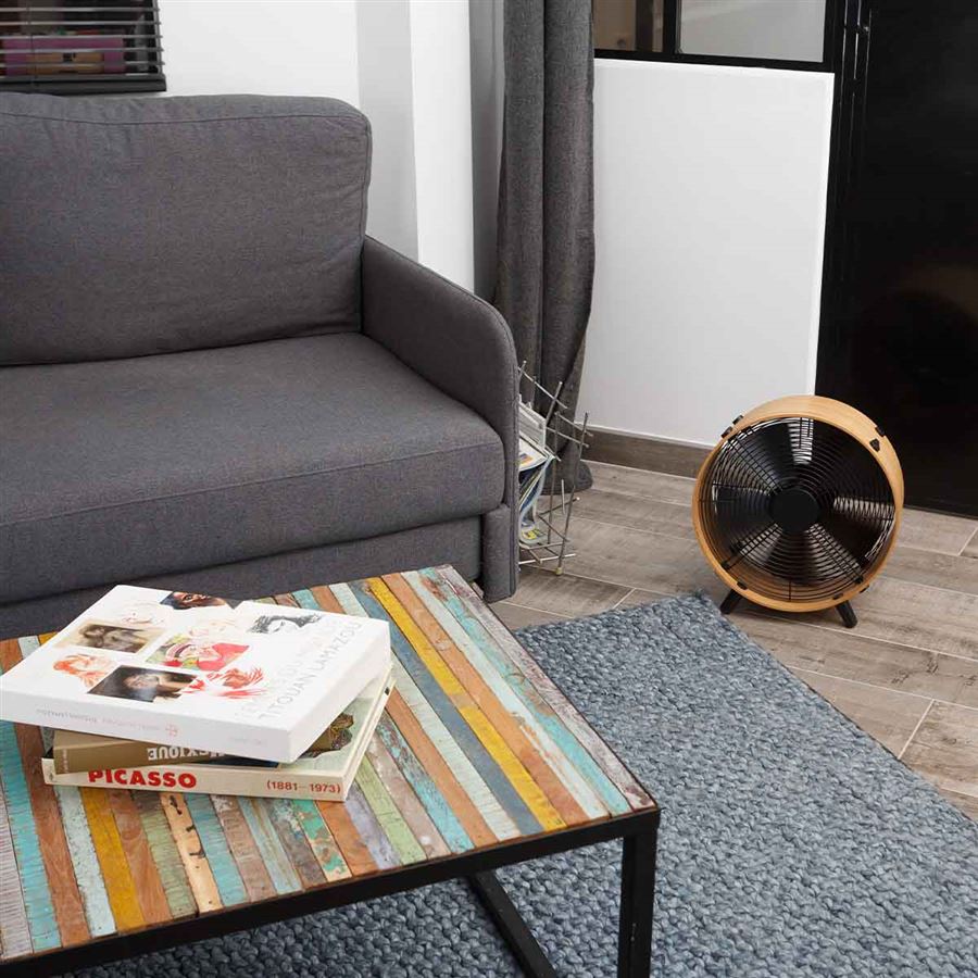 · Stílusos álló ventilátor bambusz és fekete fém kombinációjából